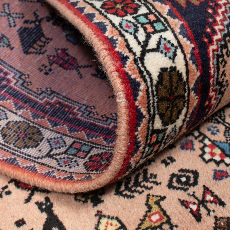 Ce tapis Abadeh très coloré est noué à la main avec beaucoup de soin. C'est un tapis extrêmement attrayant et résistant qui est noué dans la ville d'Abadeh, dans le sud-ouest de l'Iran. La petite ville d'Abadeh est située entre Ispahan et Chiraz. Le motif est influencé par les nomades et se compose souvent d'un hexagone au centre avec une rosace ou un médaillon.