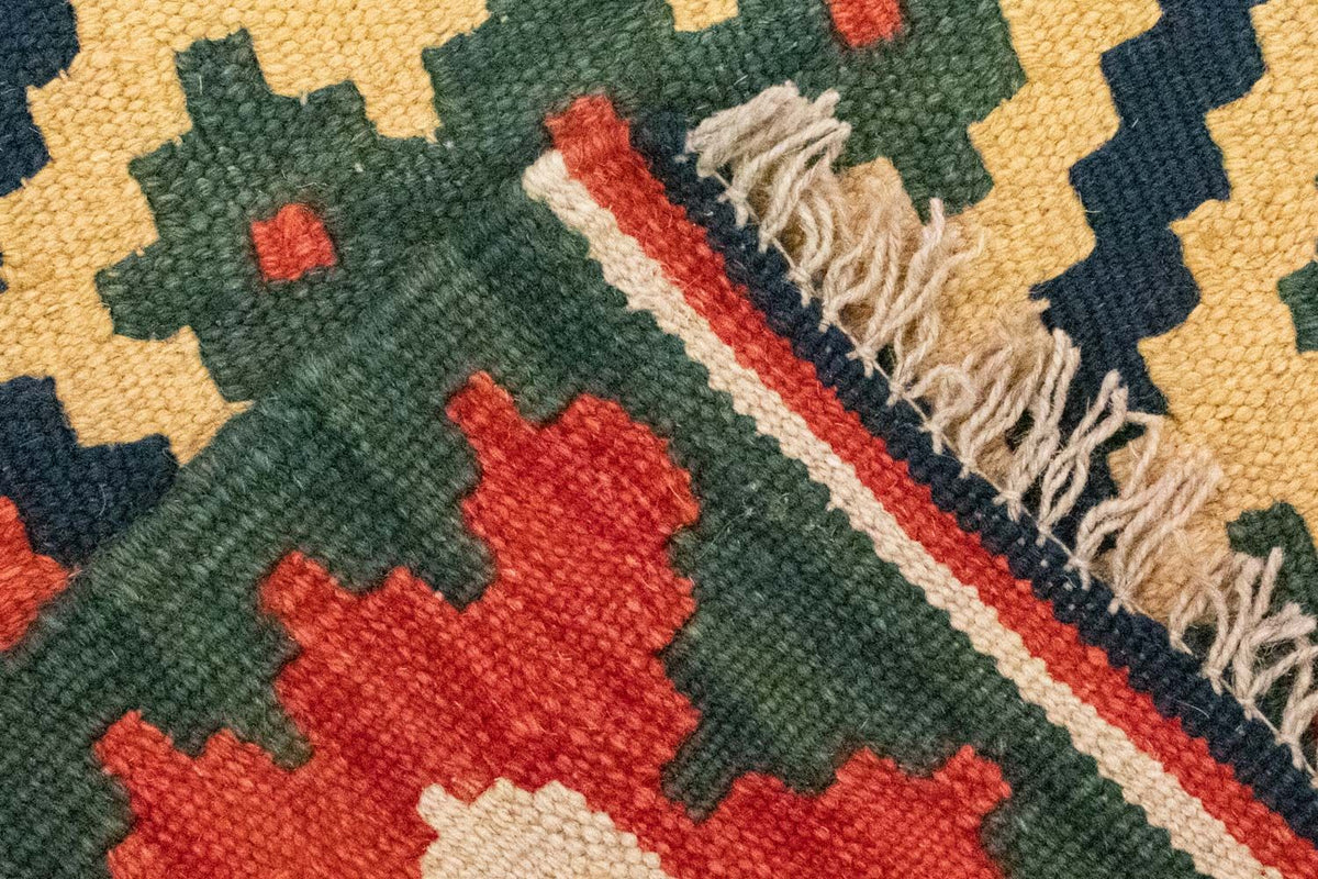 Ce kilim artistique - Oriental séduit l'œil par ses couleurs tendance. Il apporte ainsi une élégance moderne et harmonieuse à votre intérieur. Contrairement aux tapis orientaux classiques, les tapis Kilim sont tissés à la main de manière traditionnelle au lieu d'être noués. Dans d'autres pays, ces exemplaires sont également utilisés comme coussins ou rideaux. Ces tapis ont un velours fin, le tissu supérieur solide est en 100% laine vierge, qui est par nature extrêmement facile d'entretien et résistante. Les experts ne qualifient de véritables kilims que les tapis fabriqués en Turquie, dans la région du Caucase, en Perse, en Afghanistan et en Turkménie. De véritables tapis d'Orient, en somme.