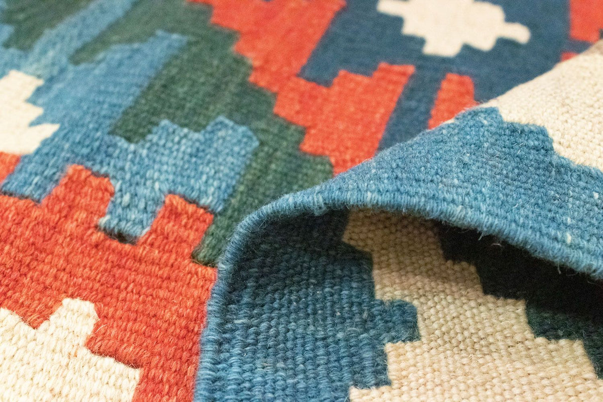 Ce kilim artistique - Oriental séduit l'œil par ses couleurs tendance. Il apporte ainsi une élégance moderne et harmonieuse à votre intérieur. Contrairement aux tapis orientaux classiques, les tapis Kilim sont tissés à la main de manière traditionnelle au lieu d'être noués. Dans d'autres pays, ces exemplaires sont également utilisés comme coussins ou rideaux. Ces tapis ont un velours fin, le tissu supérieur solide est en 100% laine vierge, qui est par nature extrêmement facile d'entretien et résistante. Les experts ne qualifient de véritables kilims que les tapis fabriqués en Turquie, dans la région du Caucase, en Perse, en Afghanistan et en Turkménie. De véritables tapis d'Orient, en somme.