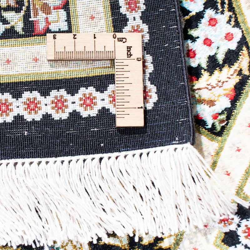 Ces magnifiques tapis sont tissés dans la ville sainte de Ghom en Perse centrale. Le tapis Ghom est l’une des œuvres d’art les plus exclusives de l’Orient. Il existe en trois variantes: laine de liège sur coton, laine de liège avec soie sur coton et soie sur soie. Même la variation Ghom tapis de laine de liège sur le coton est excellente. La laine de liège provient de la tonte du cou d’agneau. Il est doux et gras, extrêmement résistant à la saleté et extrêmement résistant. La laine de liège permet de filer des fils particulièrement fins qui donnent un tissu fin dans des nœuds denses. Les autres variations de tapis Ghom parlent d’elles-mêmes. Plus un tapis contient de soie, plus l’enchaînement est fin, plus le motif est détaillé, plus la qualité du tapis est élevée.
