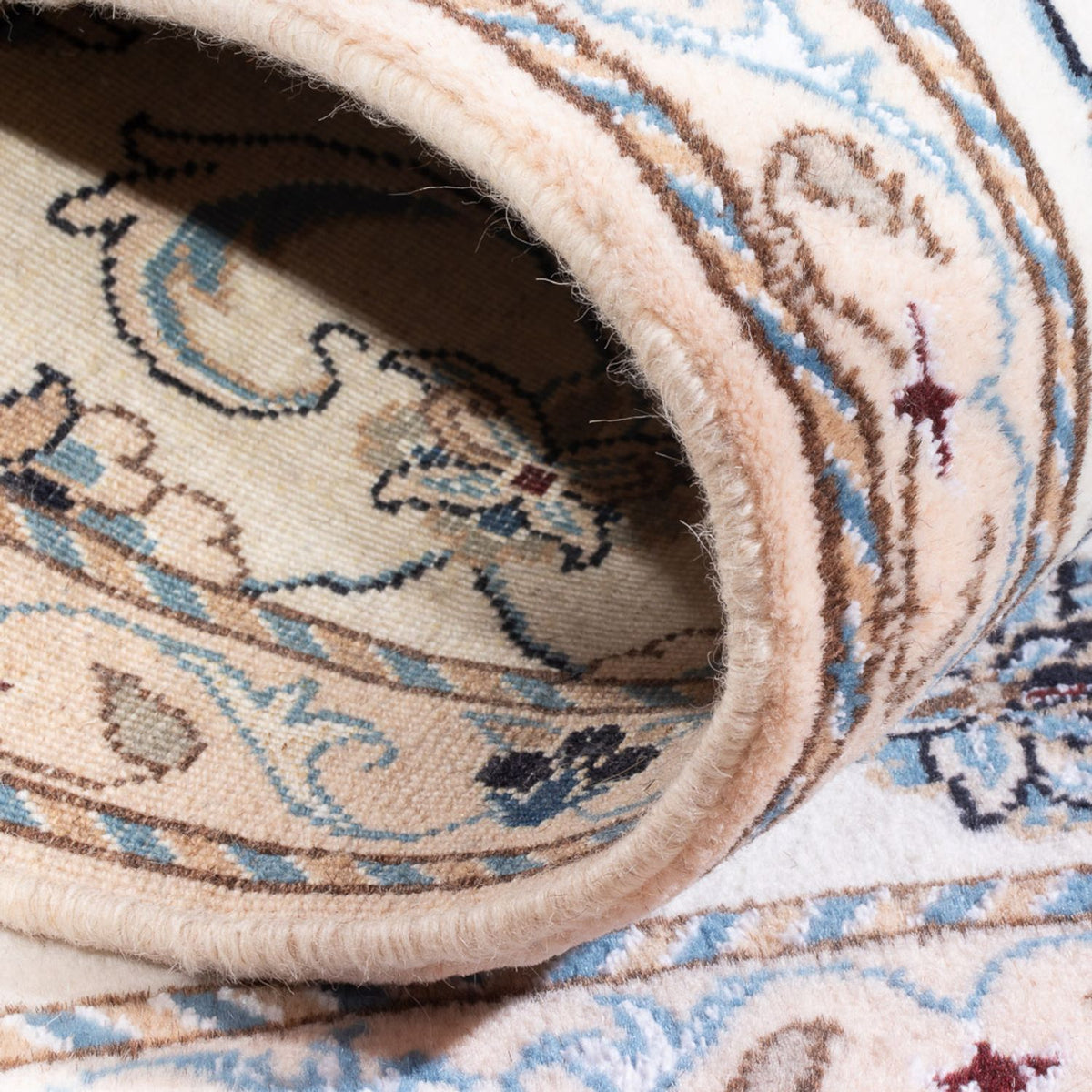 Les tapis Naïn sont noués avec une finesse exceptionnelle. Le matériau utilisé pour le velours est généralement la meilleure laine de liège veloutée et toujours la soie, afin de pouvoir réaliser un dessin exact de médaillons et de motifs all-over. On distingue 4 niveaux de qualité du Naïn, indiqués en "La" : 4La, 6La, 9La, 12La. Il s'agit d'une indication de qualité qui se réfère au nombre de couches de fils contenues dans chaque fil de chaîne. Plus le nombre indiqué est faible, plus la densité de nœuds est élevée, plus le tapis est fin et dense. Les Naïns comptent parmi les plus beaux du monde. Ils sont également très appréciés des collectionneurs. Grâce à leur élégance sobre, les Naïns s'intègrent également dans les intérieurs modernes et apportent du luxe dans la maison.