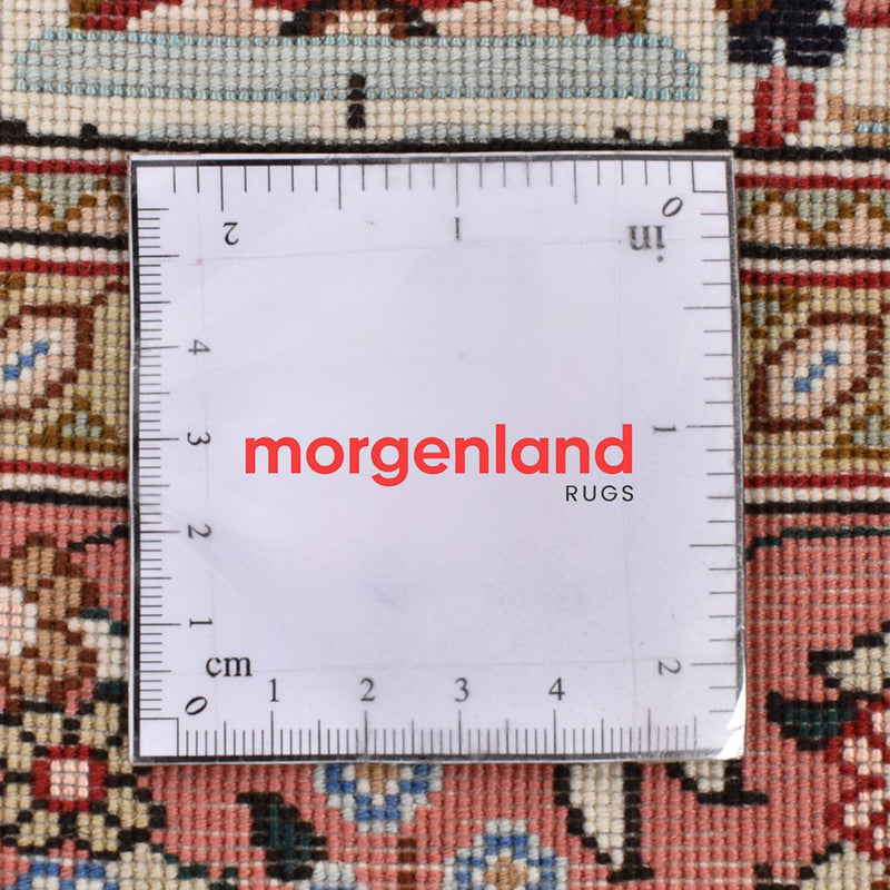 Ce tapis persan finement noué – Täbriz – Royal est fabriqué avec de la laine de liège de haute qualité, avec un travail manuel minutieux et irréprochable. Le Täbriz 40 Raj est l’un des plus beaux de sa catégorie. Ces tapis ont fondé la bonne réputation de l’art persan de tissage. C’est un tapis très populaire de l’une des meilleures régions de la Perse. Ils ont souvent un grand médaillon, placé au centre, composé de beaux motifs floraux, un motif typiquement oriental. Tapis Täbriz ont souvent le nom supplémentaire Raj. On fait la différence entre 40, 50, 60, 70, 80 Raj. Plus le nombre indiqué est élevé, plus le tapis est fin et dense. Raj est un nom de qualité qui se réfère au nombre de nœuds sur une largeur d’environ 70 mm. En raison de l’enchaînement dense, le tapis est résistant, insensible et bien adapté à une utilisation extrême. L’élégance classique et l’opulence des couleurs caractérisent ce tapis noble.