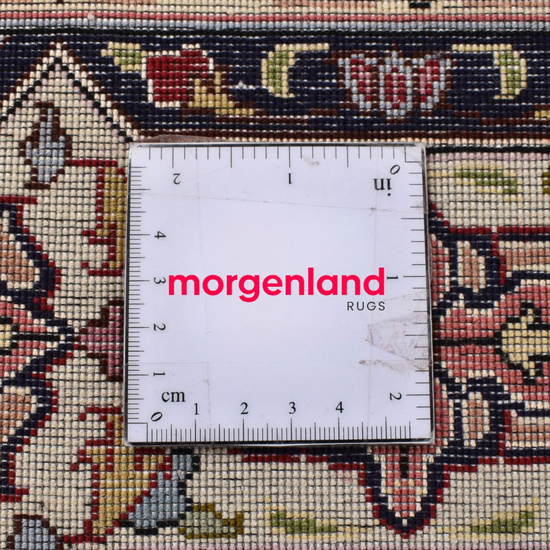 Ce tapis persan finement noué – Täbriz – Royal est fabriqué avec de la laine de liège de haute qualité, avec un travail manuel minutieux et irréprochable. Le Täbriz 40 Raj est l’un des plus beaux de sa catégorie. Ces tapis ont fondé la bonne réputation de l’art persan de tissage. C’est un tapis très populaire de l’une des meilleures régions de la Perse. Ils ont souvent un grand médaillon, placé au centre, composé de beaux motifs floraux, un motif typiquement oriental. Tapis Täbriz ont souvent le nom supplémentaire Raj. On fait la différence entre 40, 50, 60, 70, 80 Raj. Plus le nombre indiqué est élevé, plus le tapis est fin et dense. Raj est un nom de qualité qui se réfère au nombre de nœuds sur une largeur d’environ 70 mm. En raison de l’enchaînement dense, le tapis est résistant, insensible et bien adapté à une utilisation extrême. L’élégance classique et l’opulence des couleurs caractérisent ce tapis noble.